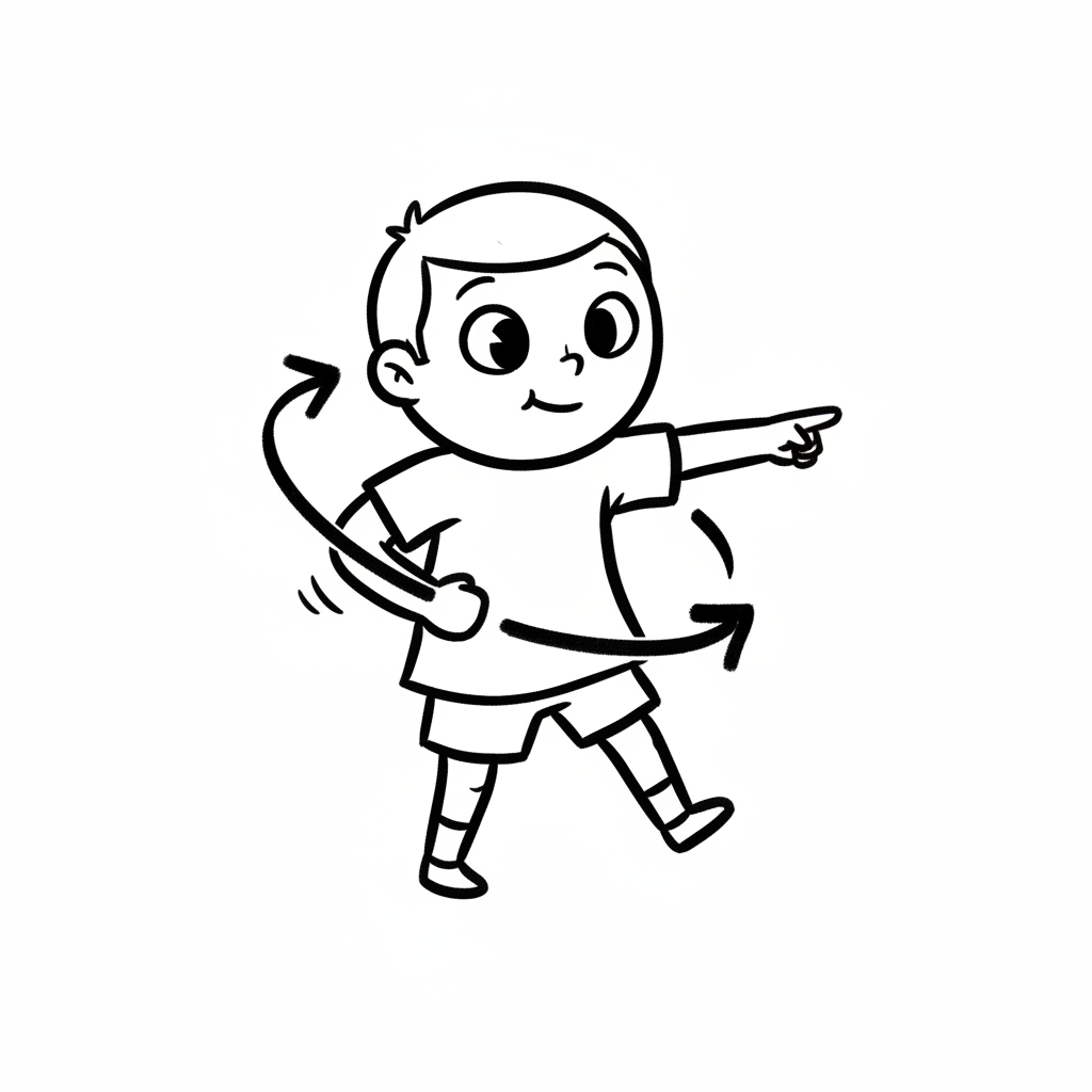 Cartoon-Junge zeigt und führt kreisende Arm- und Rumpfbewegungen aus, als Übungsanleitung.