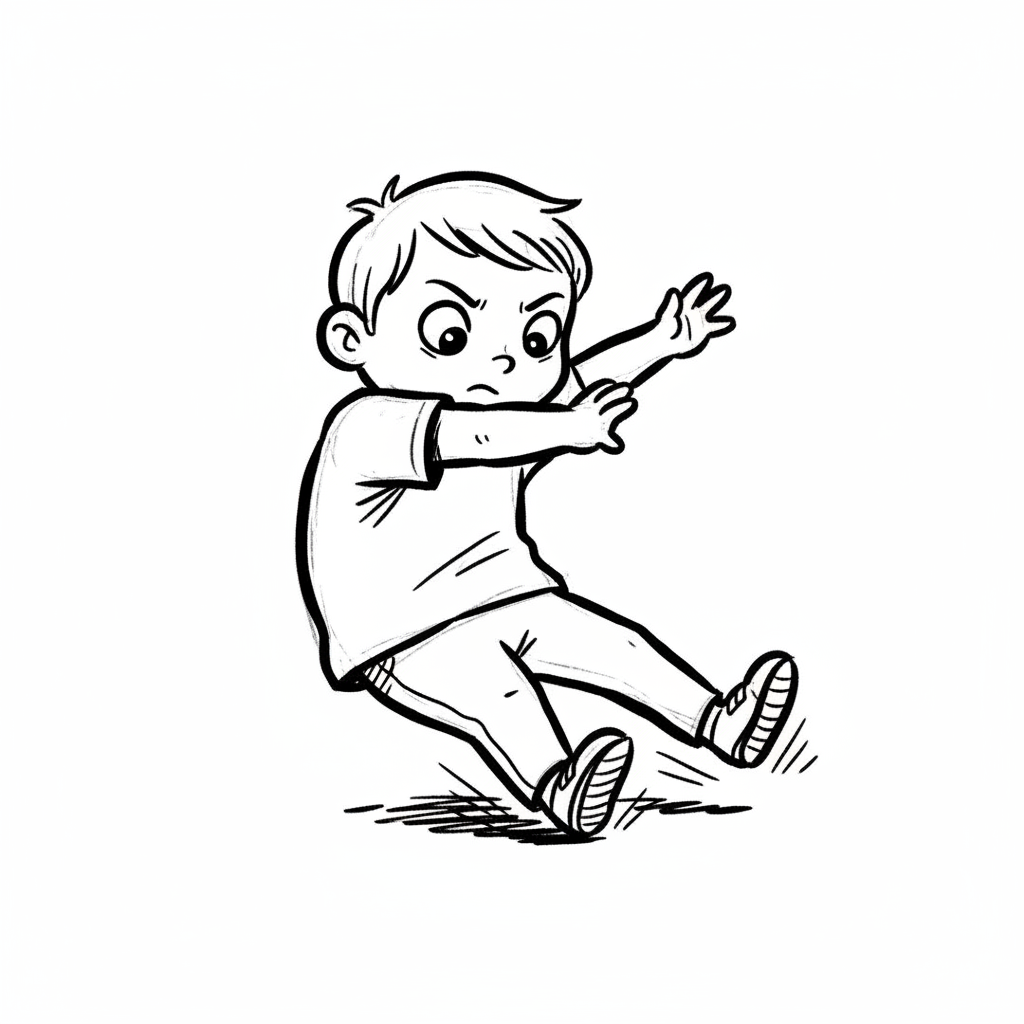 Wütender Cartoon-Junge fällt oder rutscht, die Arme ausgestreckt. Schwarz-weiß-Zeichnung.