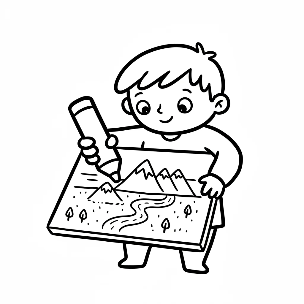 Ein lächelnder Junge malt eine detaillierte Berg- und Flusslandschaft mit einem großen Stift.