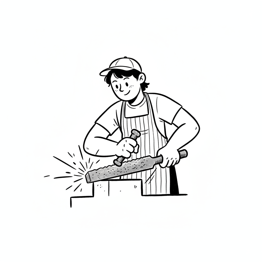 Cartoon eines Handwerkers mit Kappe und Schürze, der mit Meißel und Hammer ein Werkstück bearbeitet.