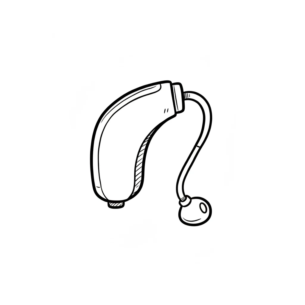 Handgezeichnetes Hörgerät mit Ohrpassstück in Schwarz-Weiß-Skizze.