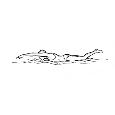 Schwarz-weiße Skizze einer schwimmenden Person im Kraulstil mit Schwimmkappe und Badeanzug.