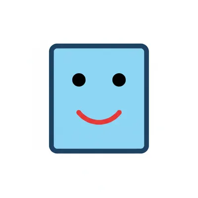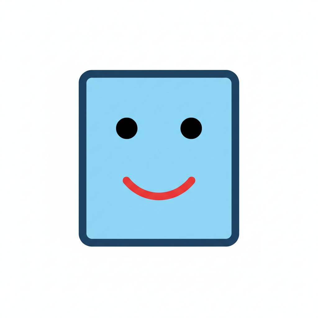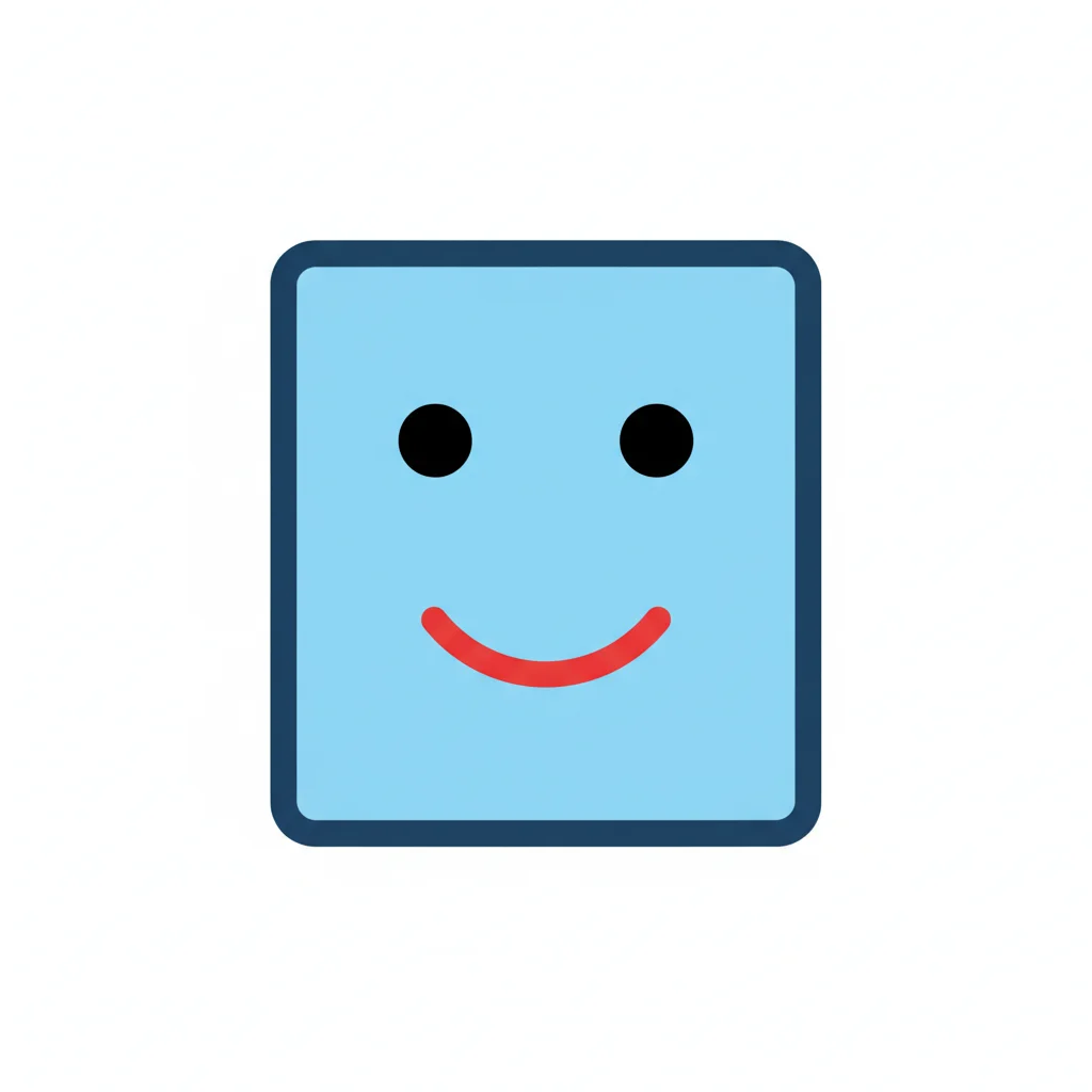 Ein freundliches, blaues Quadrat-Emoji mit schwarzen Augen und einem roten Lächeln.