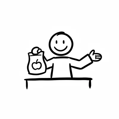 Ein fröhlicher Mensch zeigt einen Beutel mit einem Apfel.