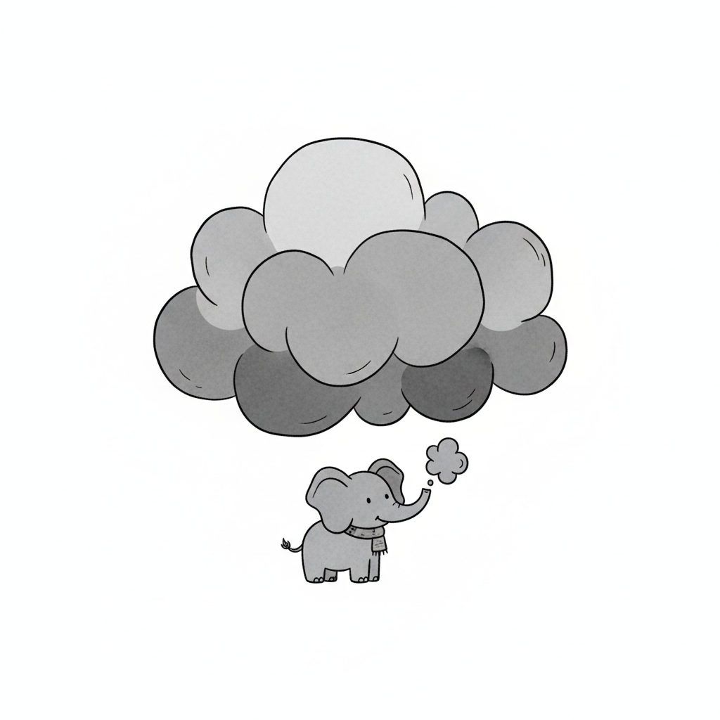 Ein niedlicher Elefant mit Schal bläst eine kleine Wolke unter einer großen, dunklen Wolke.