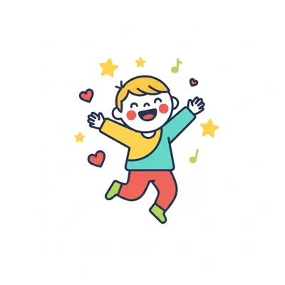 Ein fröhlicher Cartoon-Junge springt mit ausgestreckten Armen, umgeben von Sternen, Herzen und Noten.