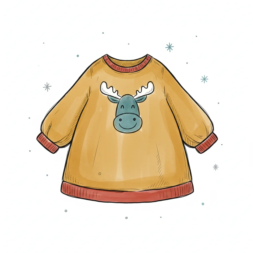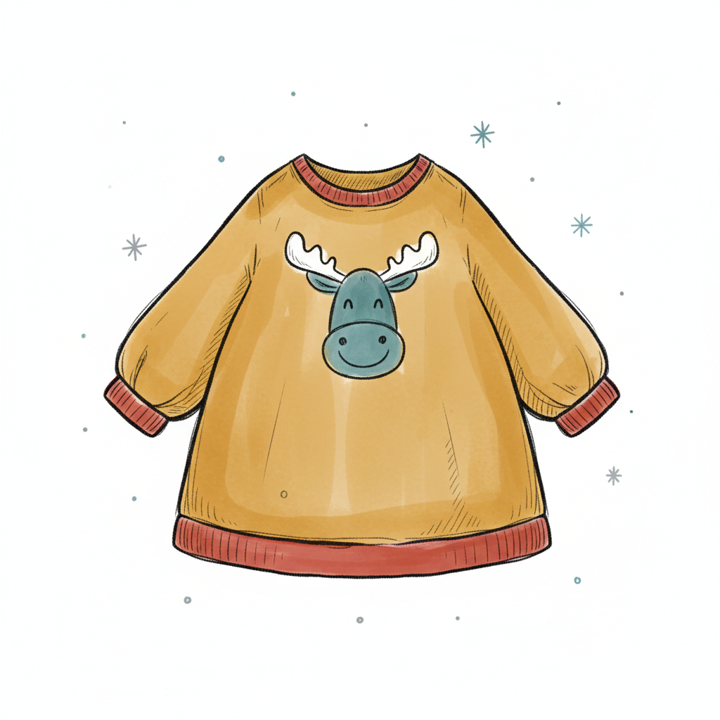 Niedlicher gelber Pullover mit lächelndem Elchgesicht und roten Bündchen, umgeben von Schneeflocken.