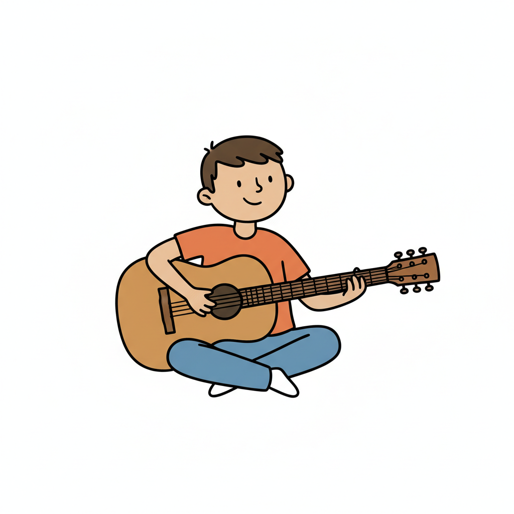 Junge sitzt mit einer Gitarre und spielt fröhlich Musik.