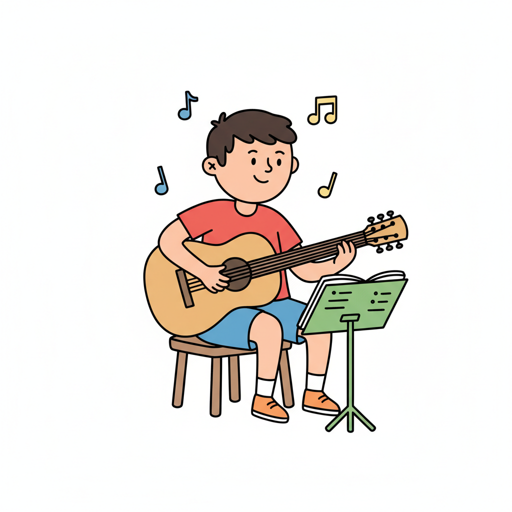 Junger Junge spielt Gitarre auf einem Stuhl mit Notenblatt.