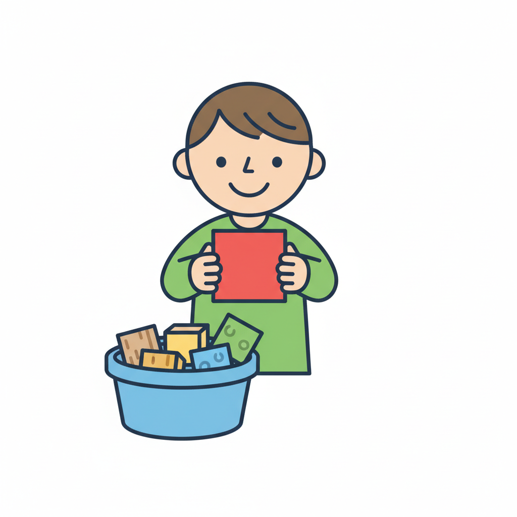 Cartoonjunge schaut verwirrt in eine rote Kiste, Fragezeichen über seinem Kopf.