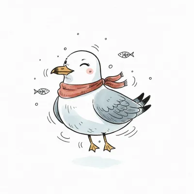 Niedliche Cartoon-Möwe mit rotem Schal, umgeben von kleinen Fischen und Punkten.