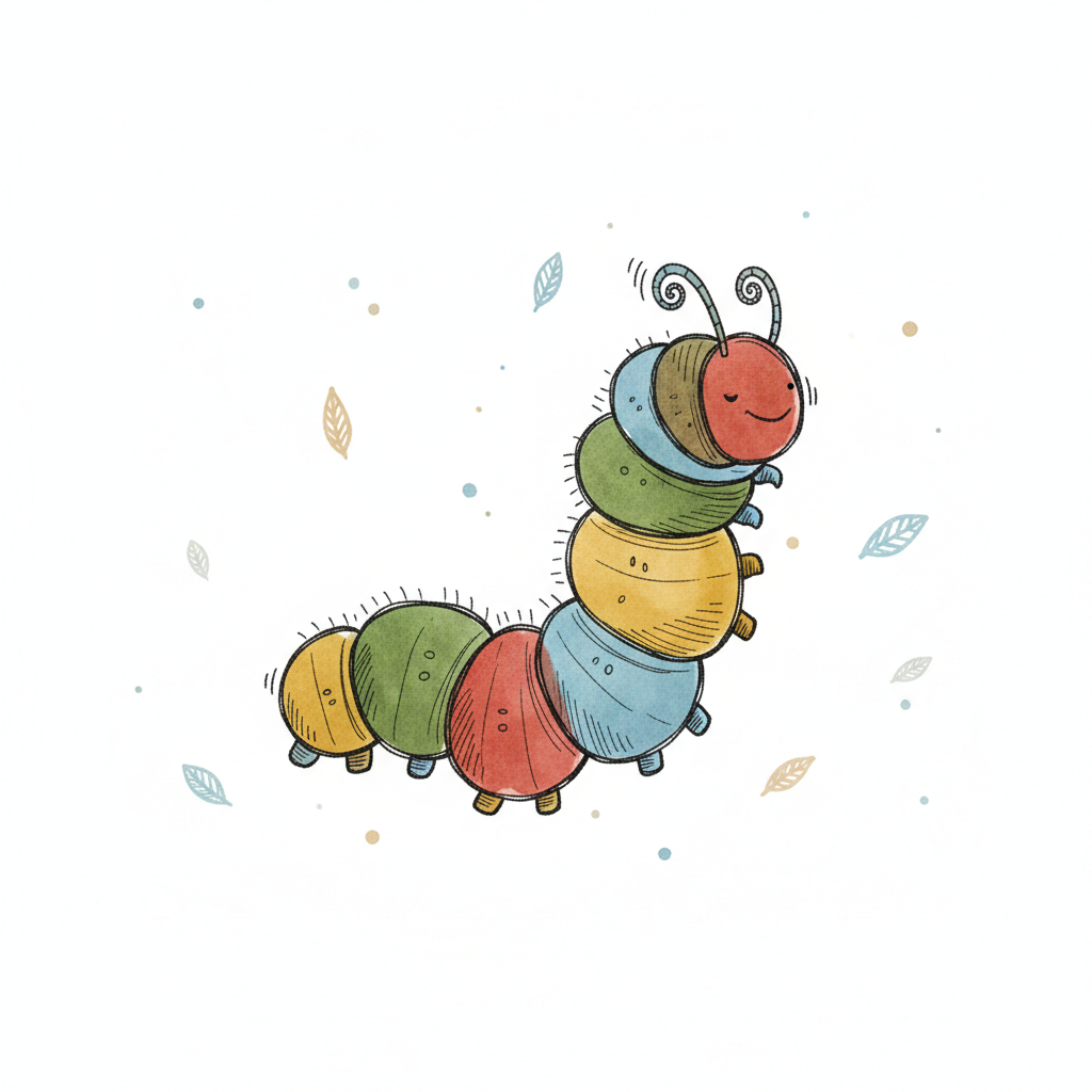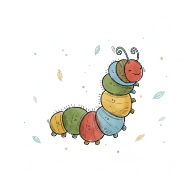 Niedliche, bunte Raupe mit lächelndem Gesicht, umgeben von kleinen Blättern auf weißem Hintergrund.