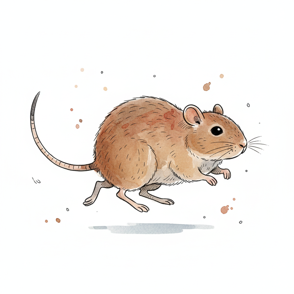 Braune Maus-Illustration im Aquarellstil, die rennt oder springt, auf weißem Hintergrund.