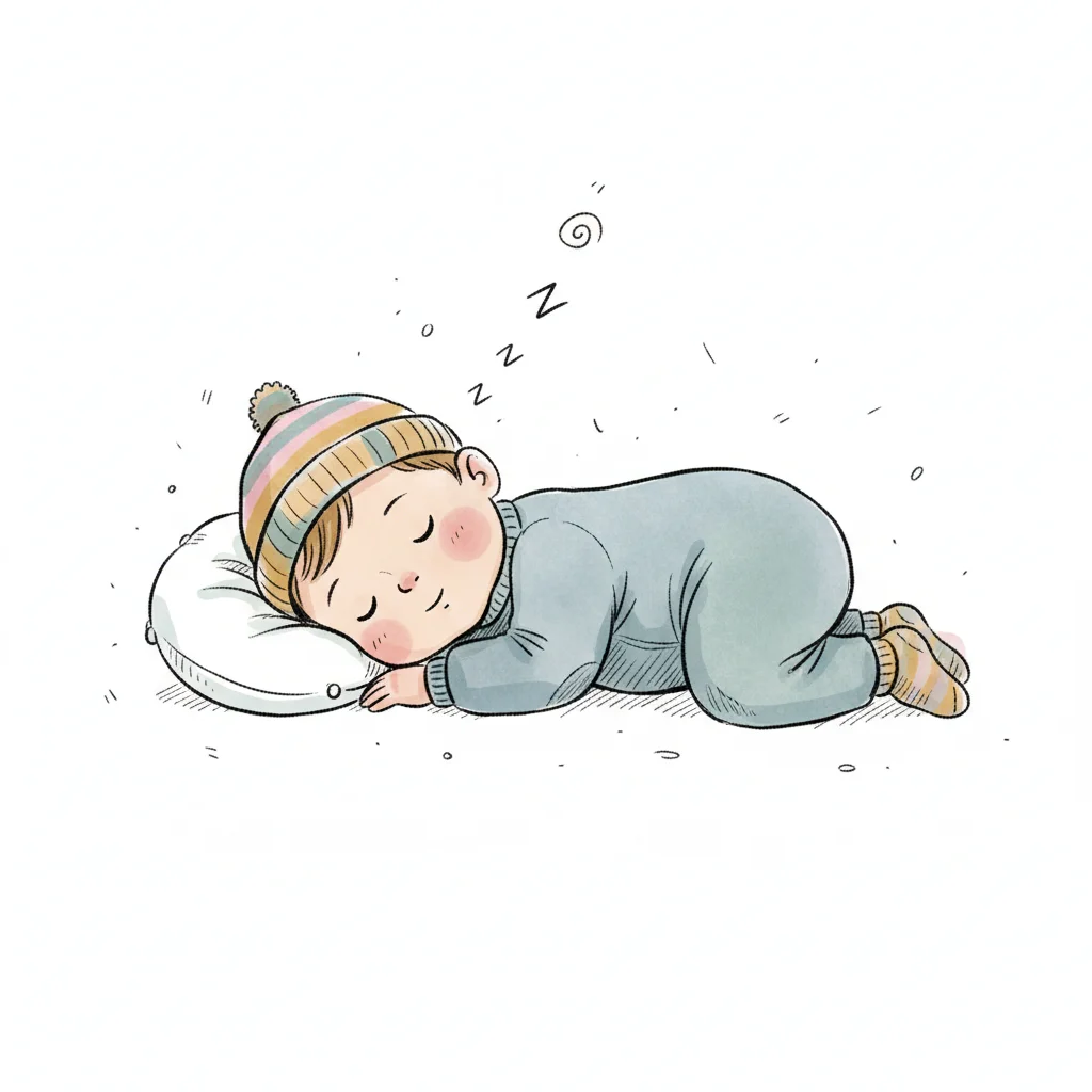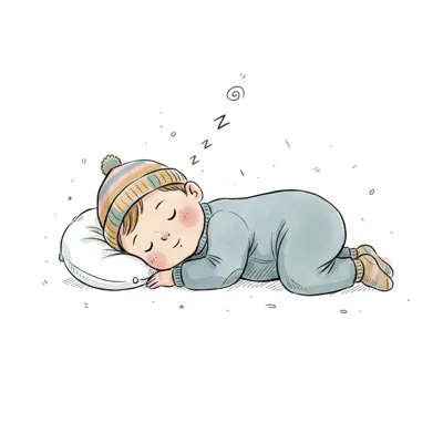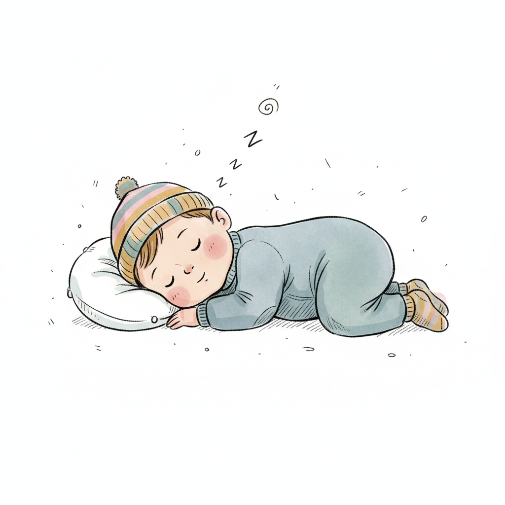 Ein schlafendes Kind in einem warmen Schlafanzug mit einer Mütze.