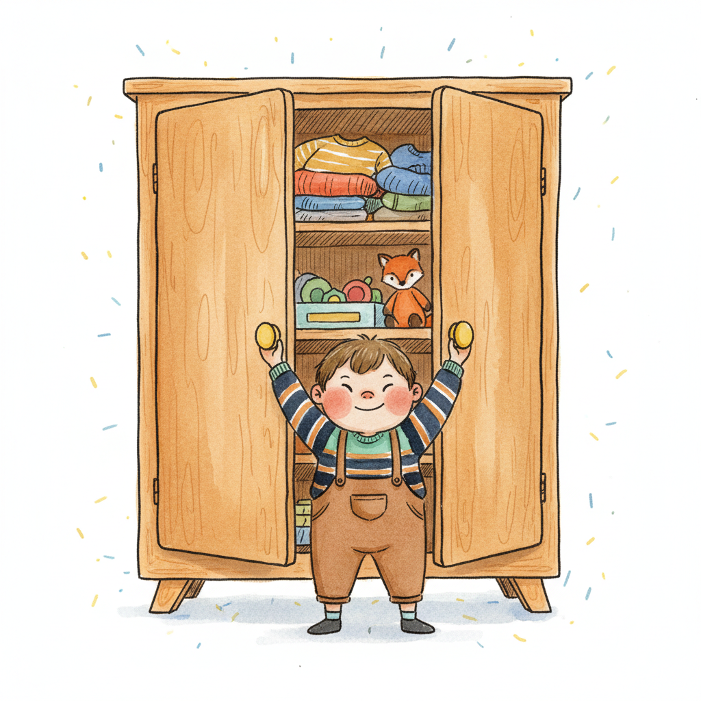 Ein Junge freut sich über seinen offenen Kleiderschrank mit Spielsachen.