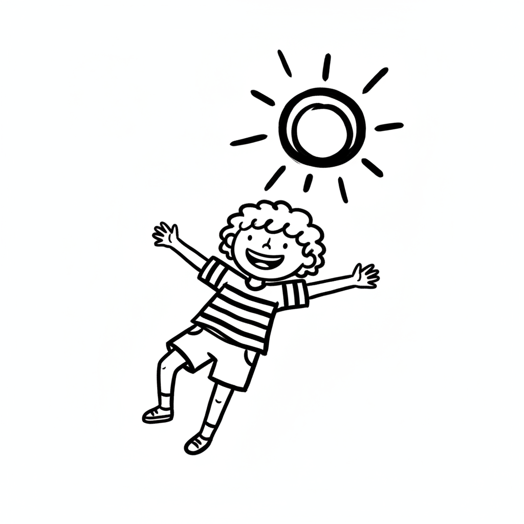 Glückliches Kind mit lockigem Haar und gestreiftem Shirt streckt die Arme zur strahlenden Sonne.