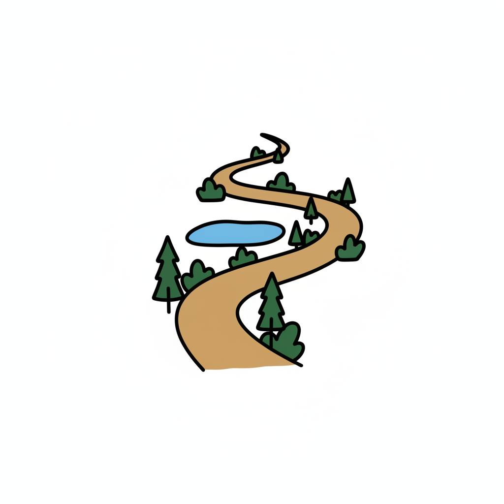 Stilisierter gewundener Weg mit Bäumen, Büschen und einem kleinen Teich auf weißem Grund.