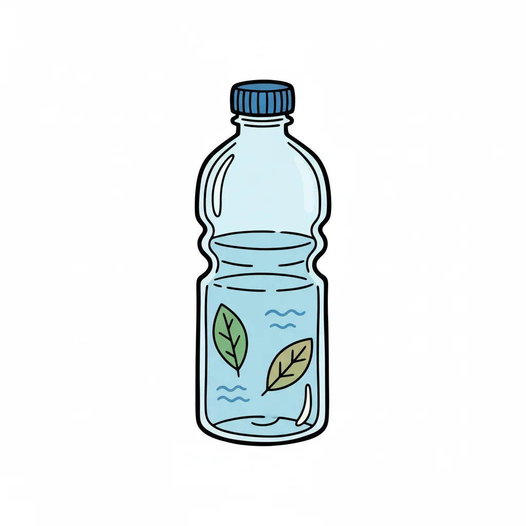 Illustrierte Wasserflasche mit blauem Deckel und zwei grünen Blättern im Wasser.