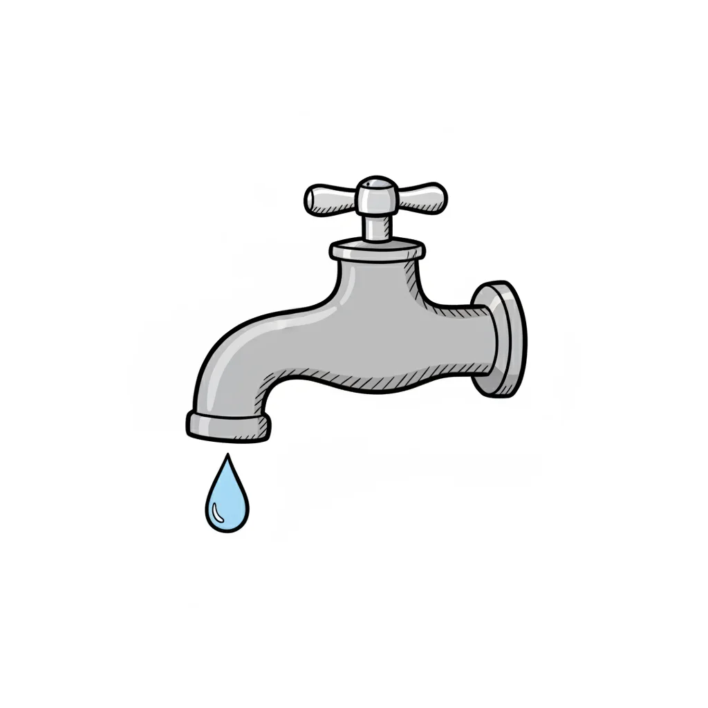 Ein grauer Wasserhahn tropft einen einzelnen blauen Wassertropfen auf weißem Hintergrund.