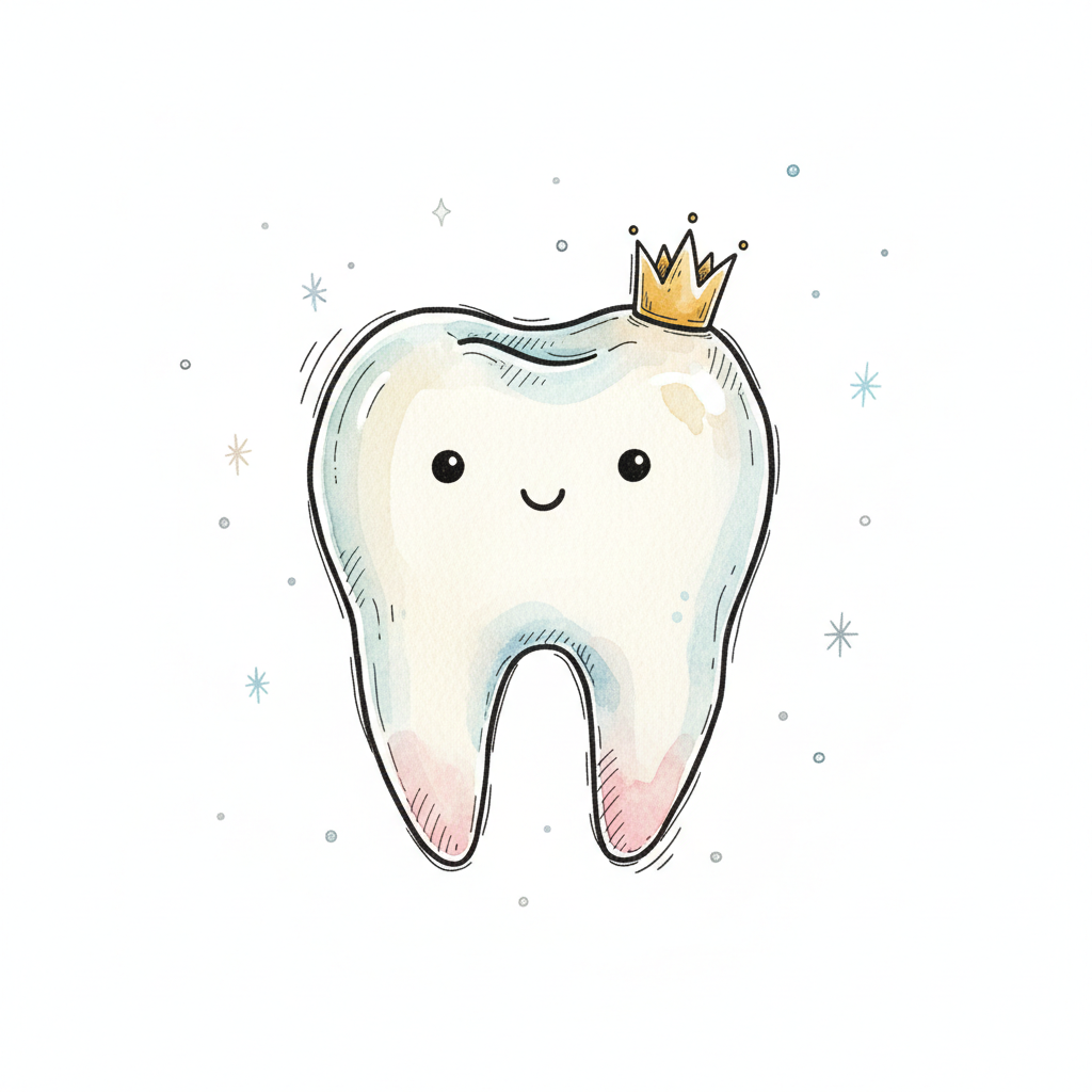 Fröhlicher Zahn mit Krone und Sternen, cartoonhaft dargestellt.