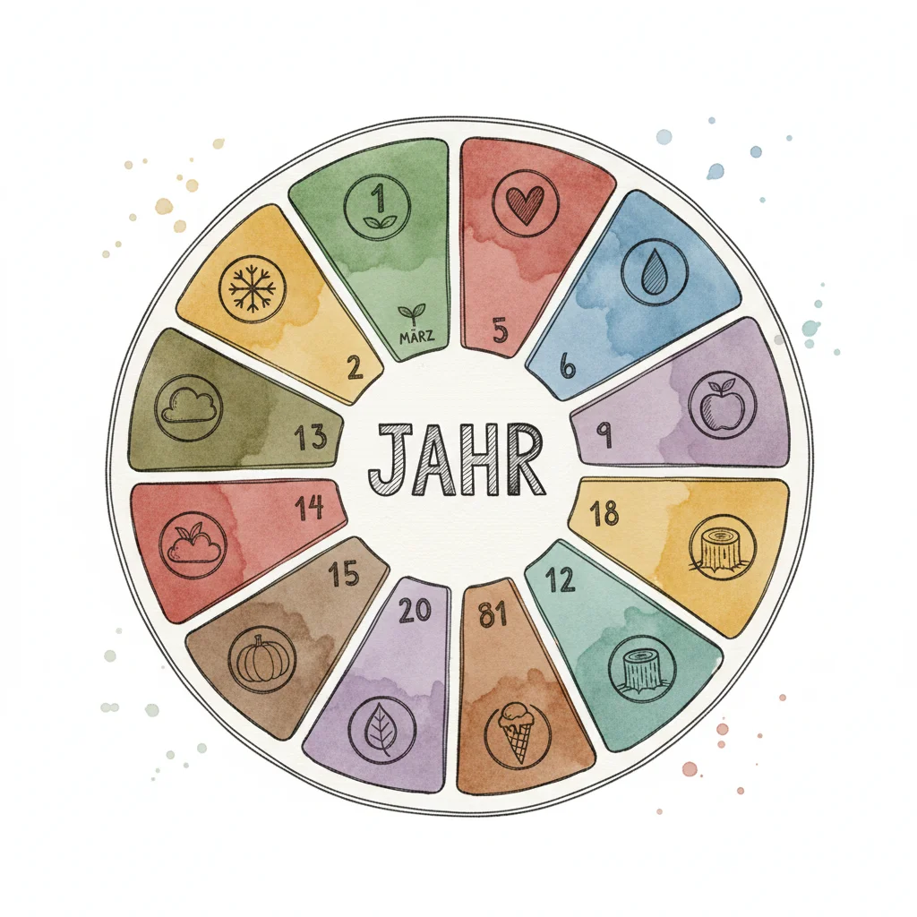 Buntes Aquarell-Kreisdiagramm mit Symbolen und Zahlen, das ein Jahr darstellt.