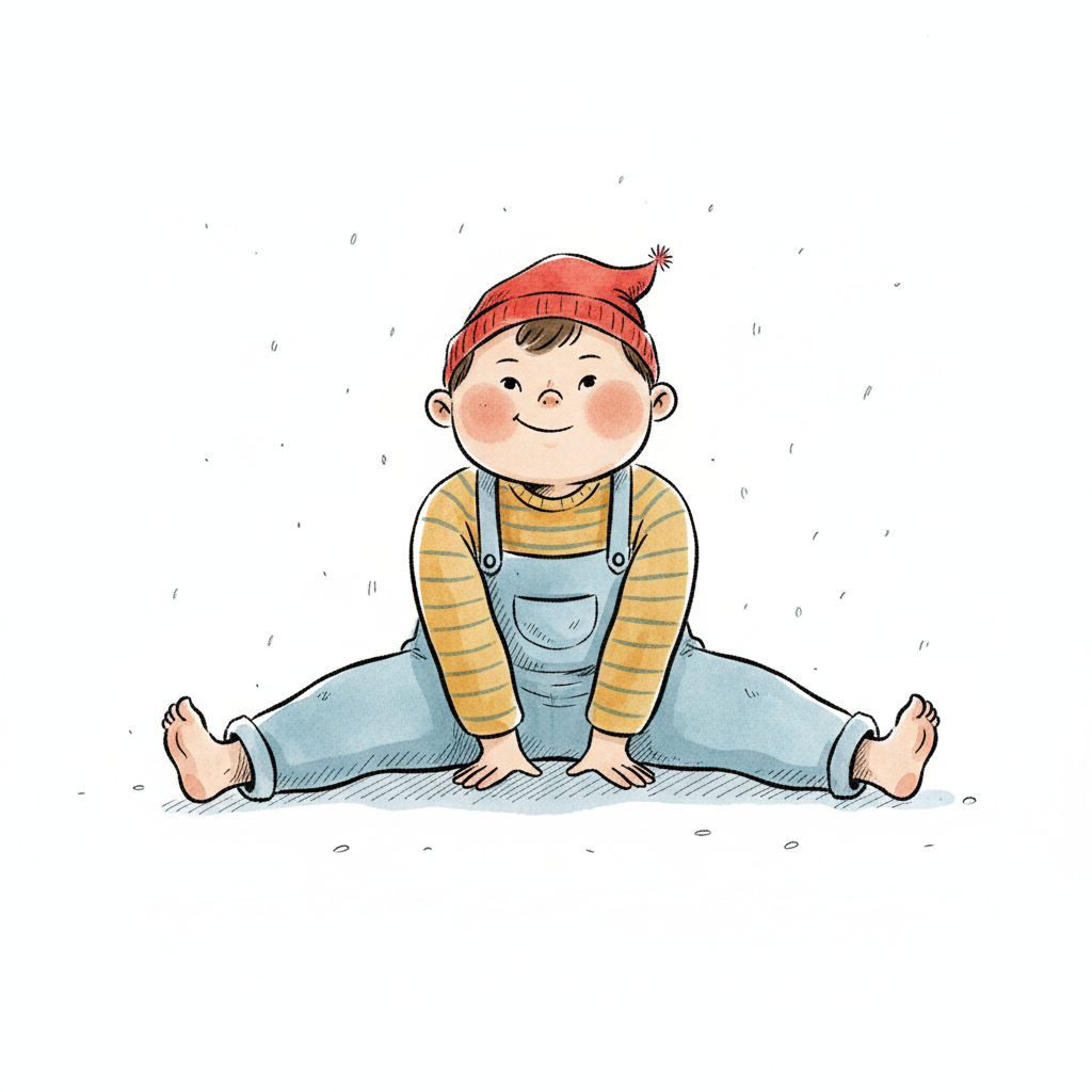 Niedliches Cartoon-Baby mit roter Mütze und Latzhose sitzt lächelnd mit gespreizten Beinen.
