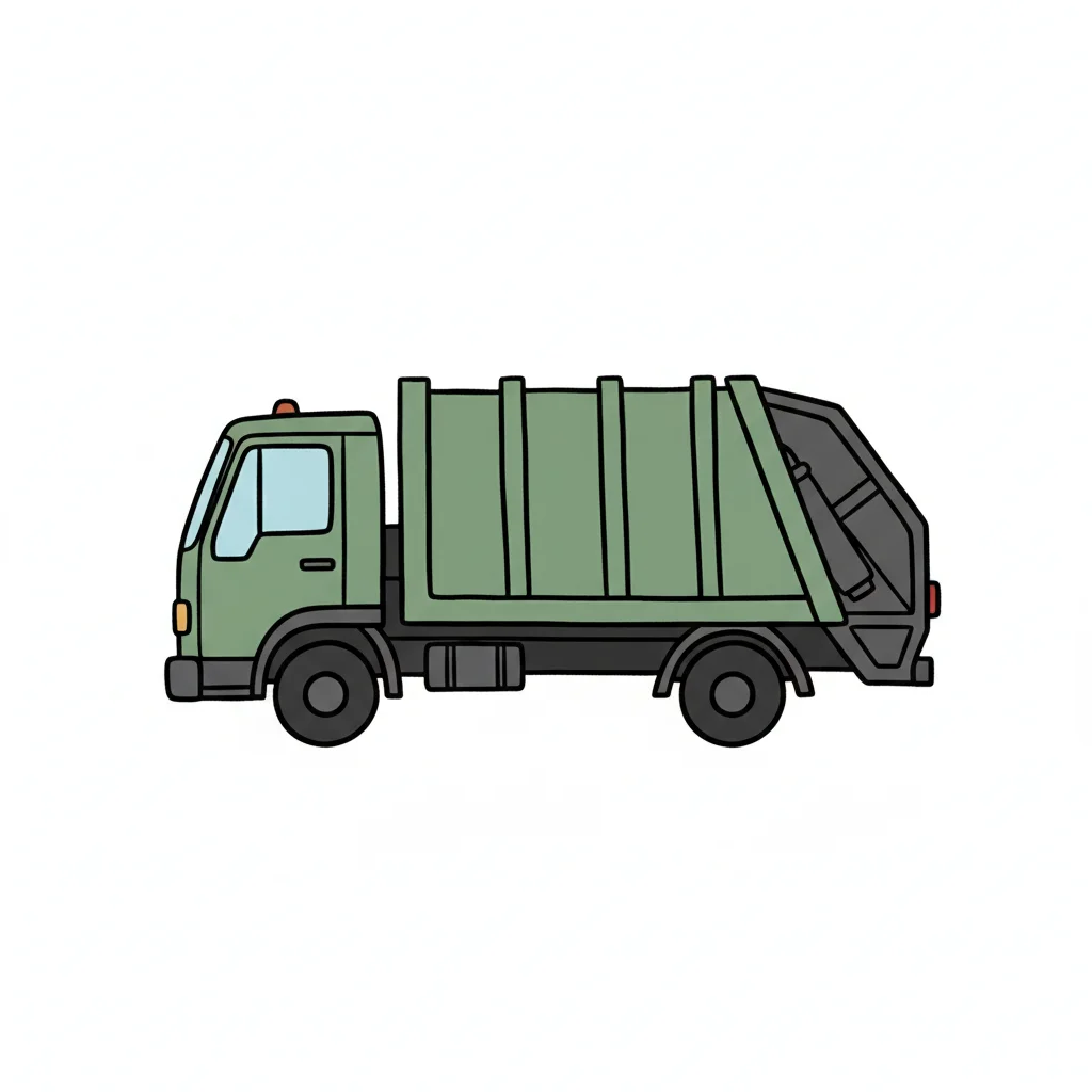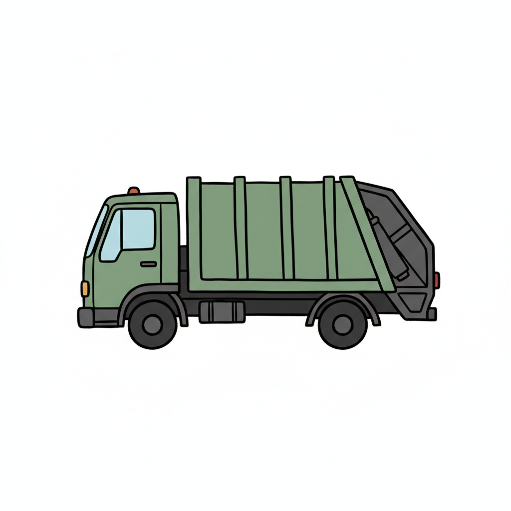 Grüner Müllwagen in Cartoon-Optik, Seitenansicht, auf weißem Hintergrund.