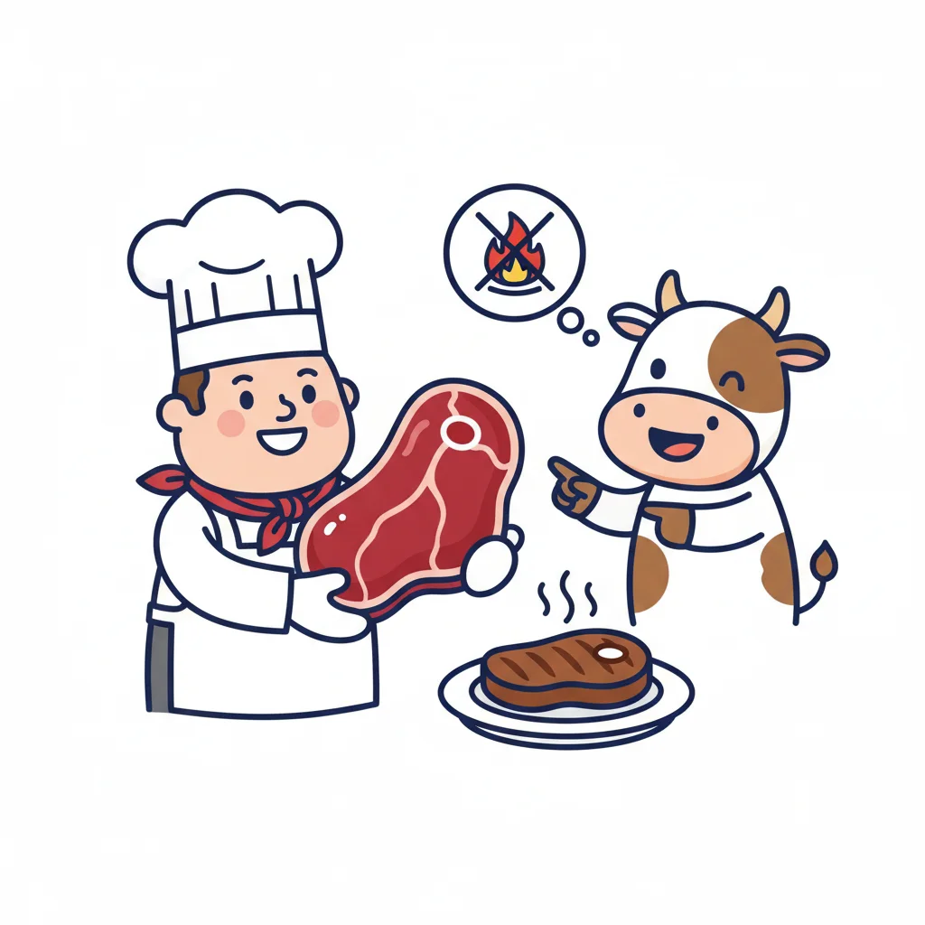 Ein Koch hält rohes Fleisch, während eine glückliche Kuh auf ein gekochtes Steak zeigt und "kein Feuer" denkt.