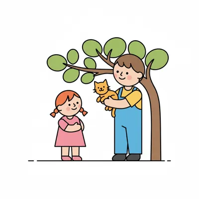 Ein Mann hält eine Katze, während ein Mädchen daneben unter einem Baum steht.