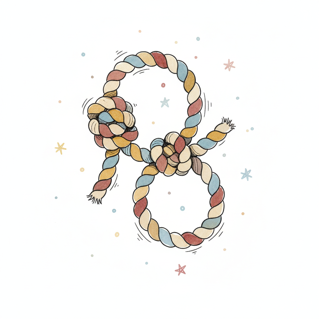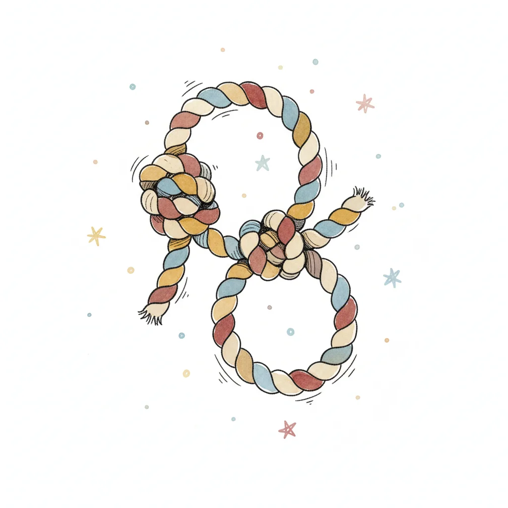 Illustriertes, mehrfarbiges Seil als Achterknoten auf weißem Grund mit Sternen.