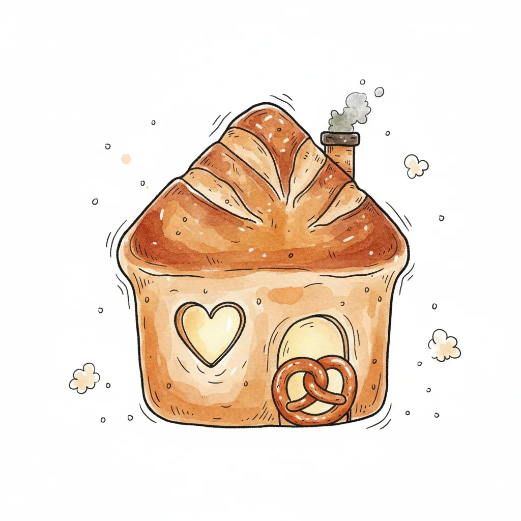 Eine lebendige Zeichnung eines Hauses aus Brot mit Herzfenster und einer Brezel.