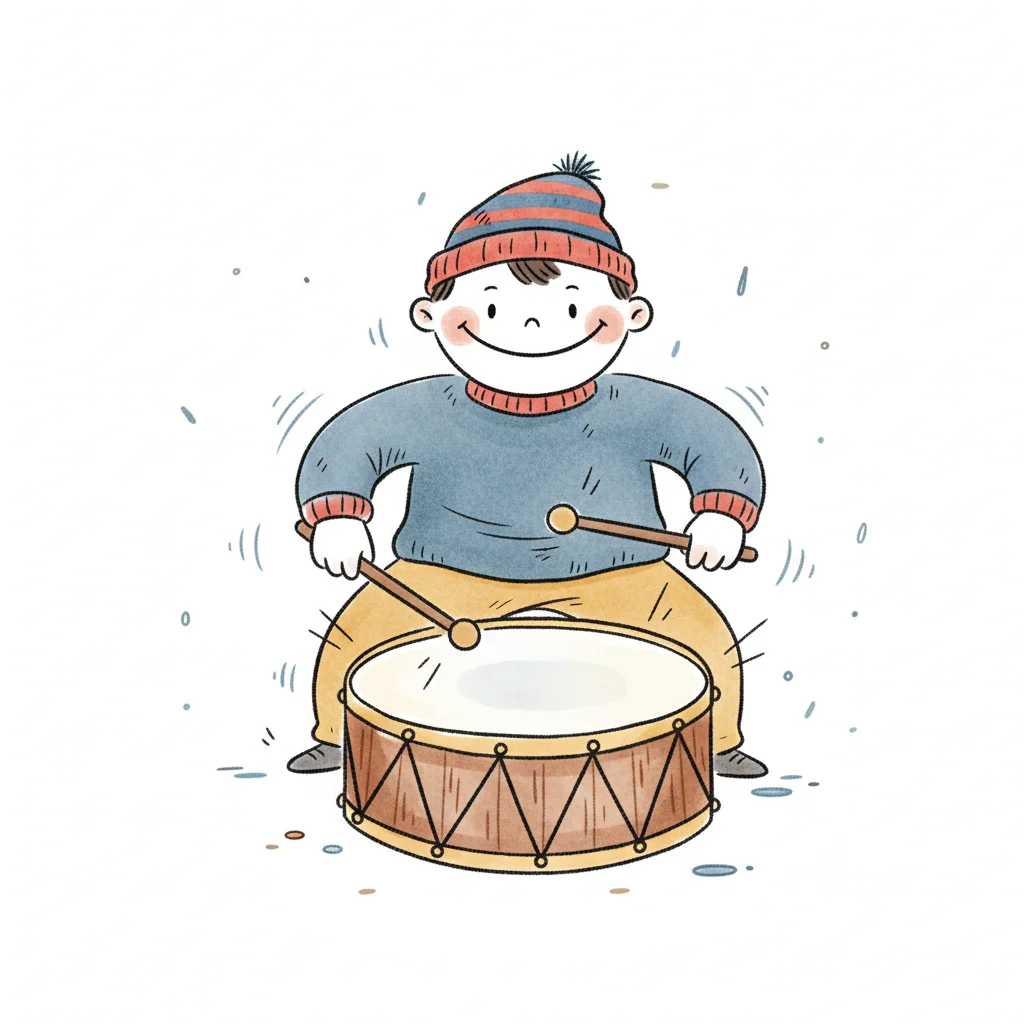 Fröhlicher Cartoon-Junge mit Mütze spielt begeistert auf einer Trommel.