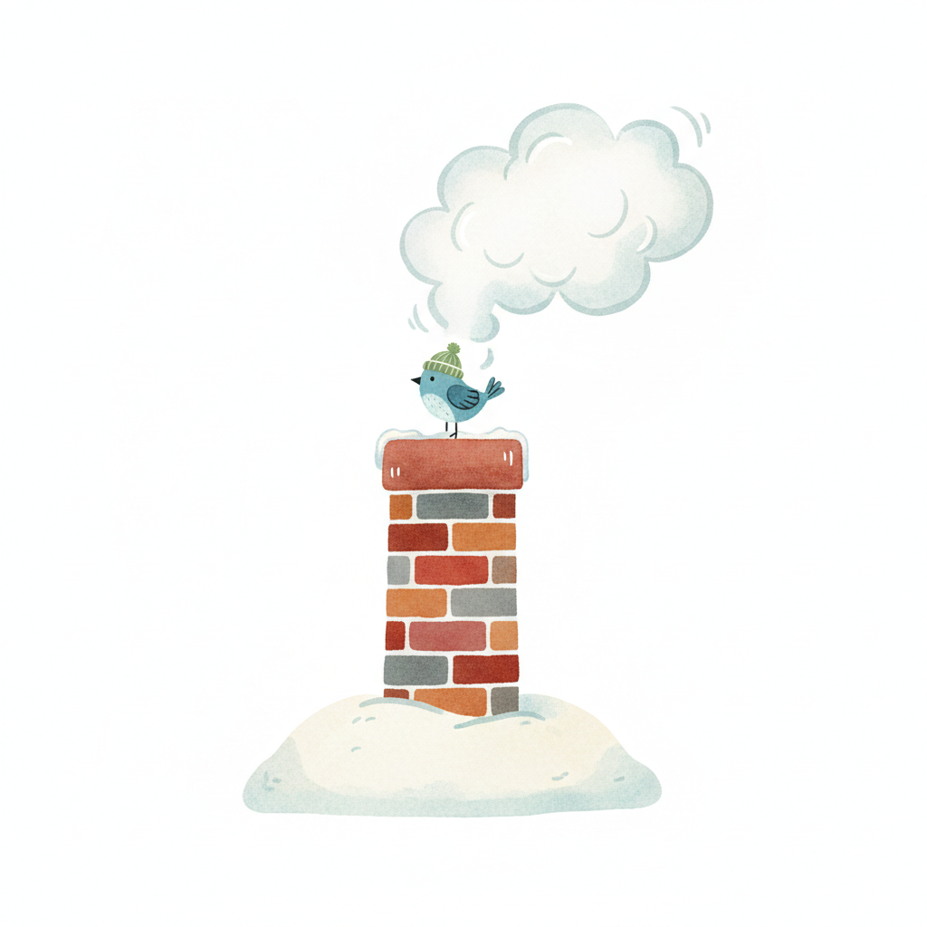 Niedlicher Vogel mit Mütze auf schneebedecktem Schornstein, aus dem Rauch aufsteigt.