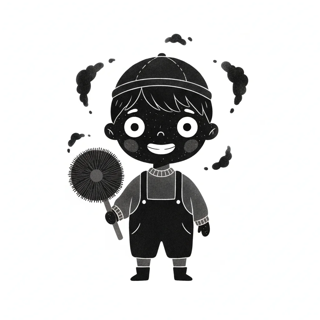 Fröhlicher Cartoon-Schornsteinfeger-Junge, rußbedeckt, mit Besen und Mütze, lächelnd.