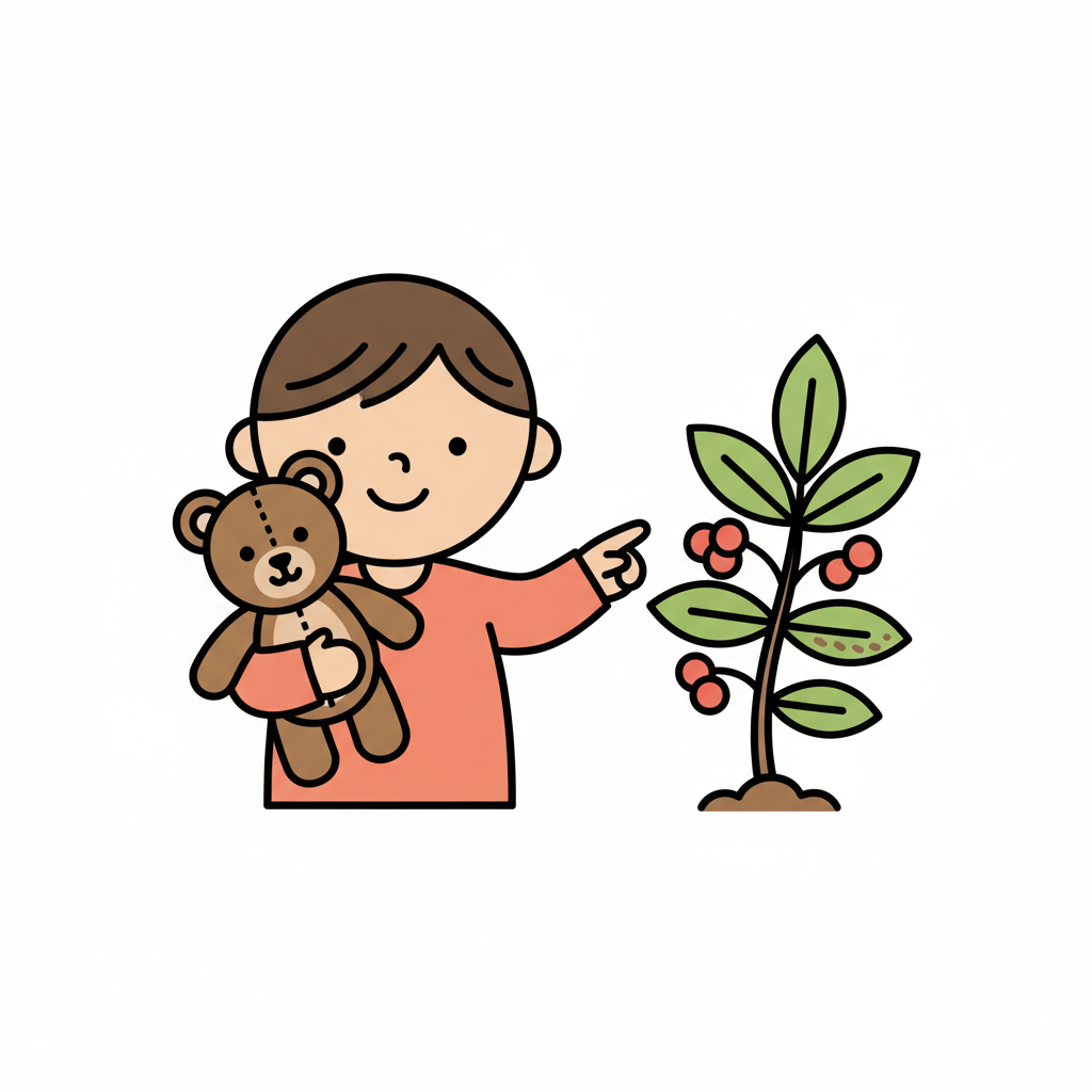 Cartoon-Kind mit Teddybär zeigt auf eine Pflanze mit roten Beeren.