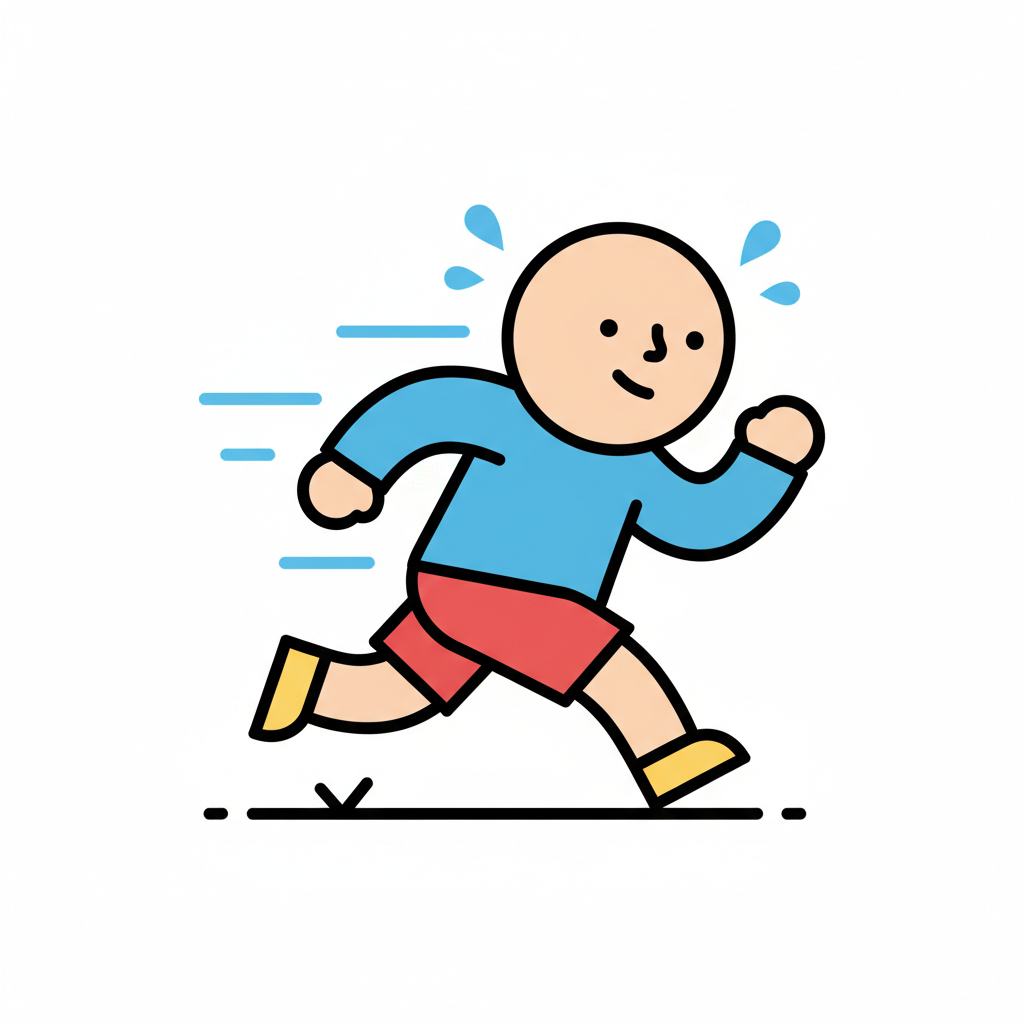Ein lächelnder Cartoon-Charakter rennt schnell und schwitzt, dargestellt in einem einfachen Stil.
