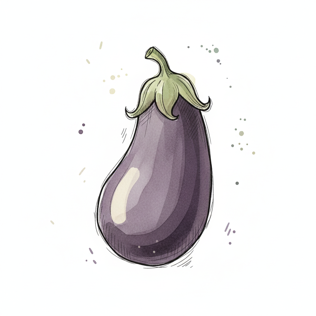 Eine stilisierte, lila Aubergine im Aquarell-Stil auf weißem Hintergrund mit Farbspritzern.