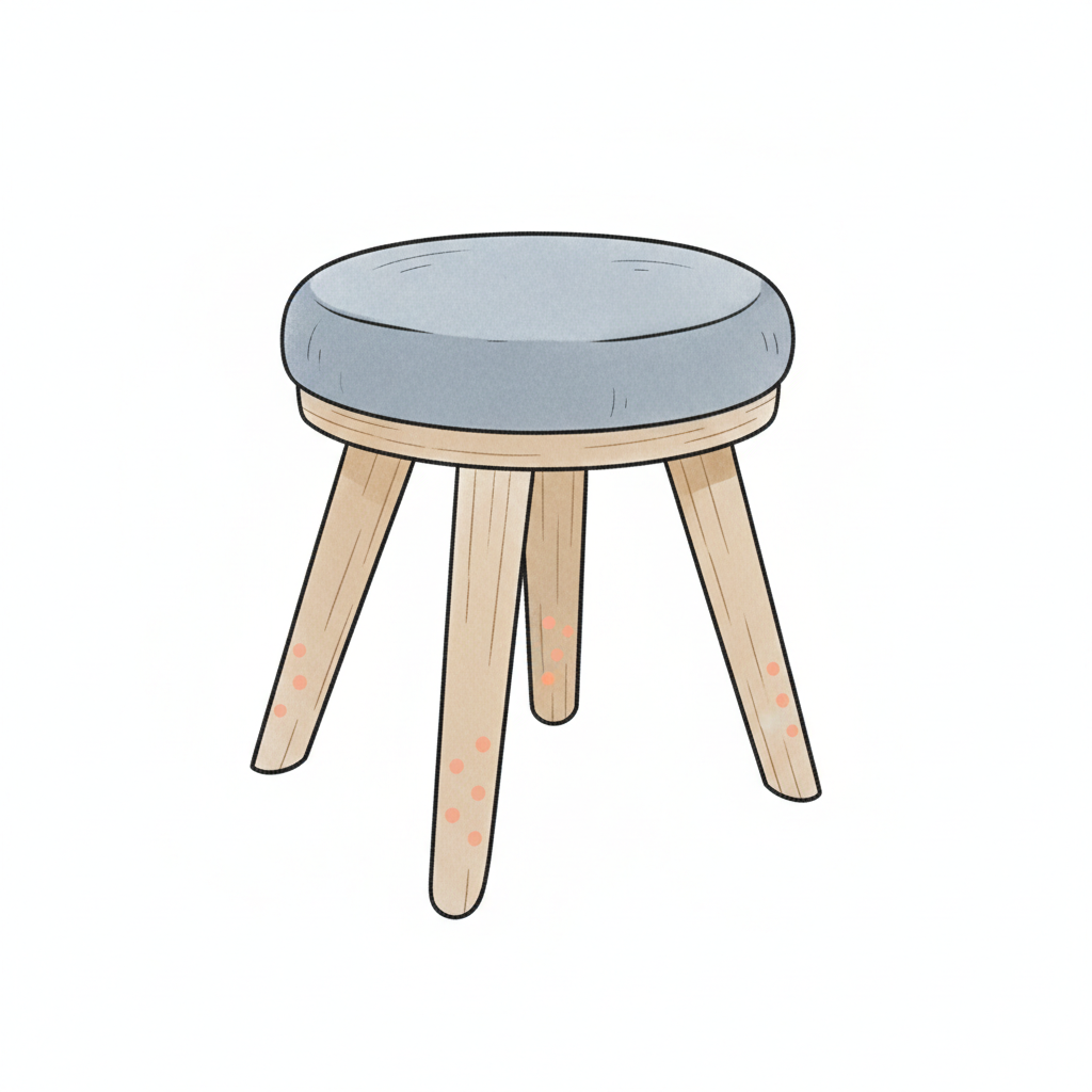 Ein gezeichneter Hocker mit rundem, hellblauem Sitz und drei Holzbeinen mit zarten Punkten.