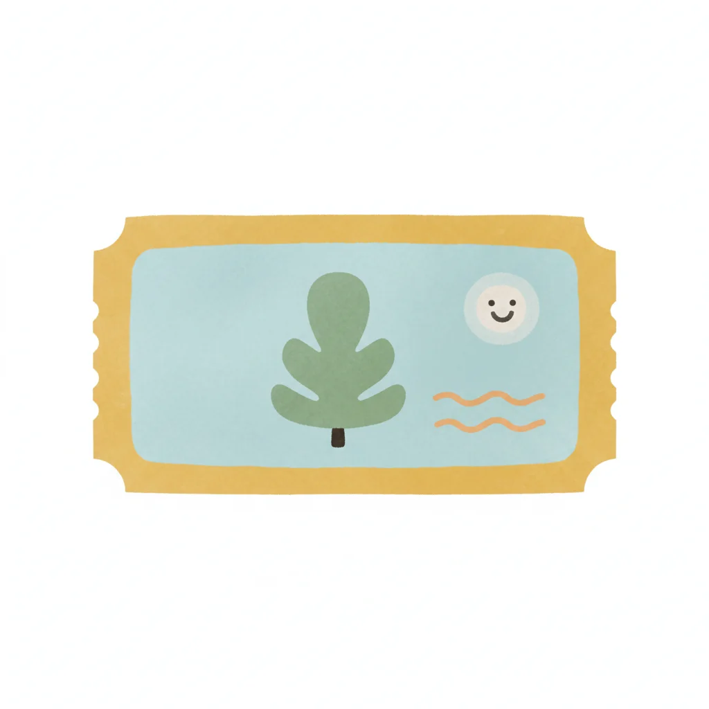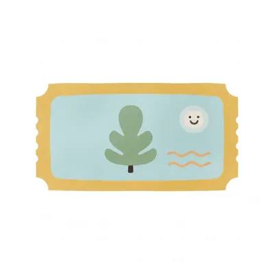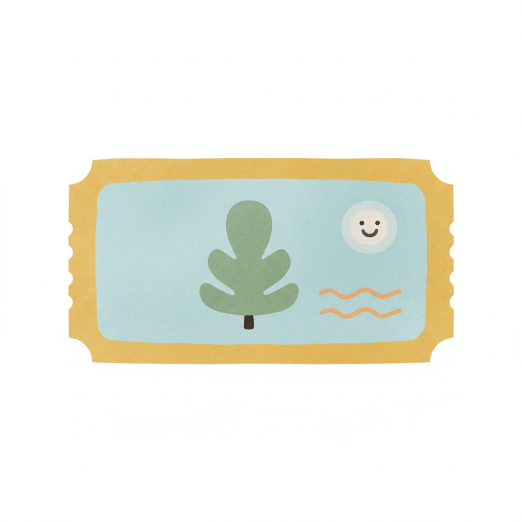 Niedliches Ticket mit Baum, lächelnder Sonne und Wellen auf hellblauem Hintergrund.