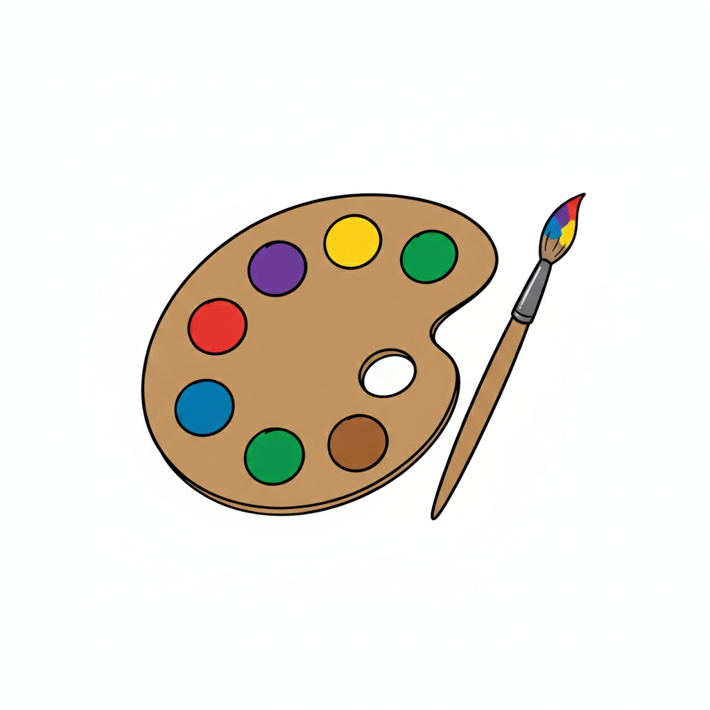 Künstlerische Utensilien: Palette, Pinsel, Buch und Leinwand.