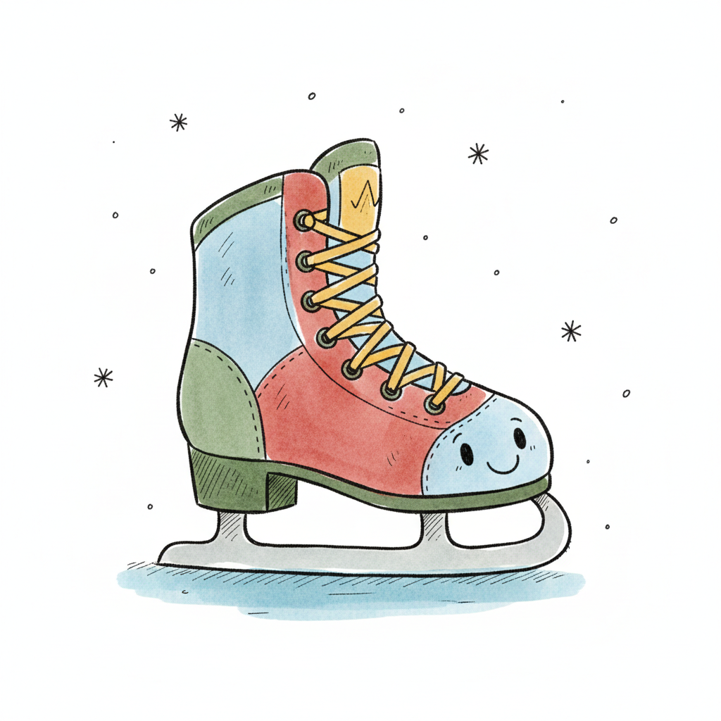 Aquarell-Illustration eines fröhlichen, bunten Schlittschuhs mit Gesicht und Schneeflocken.