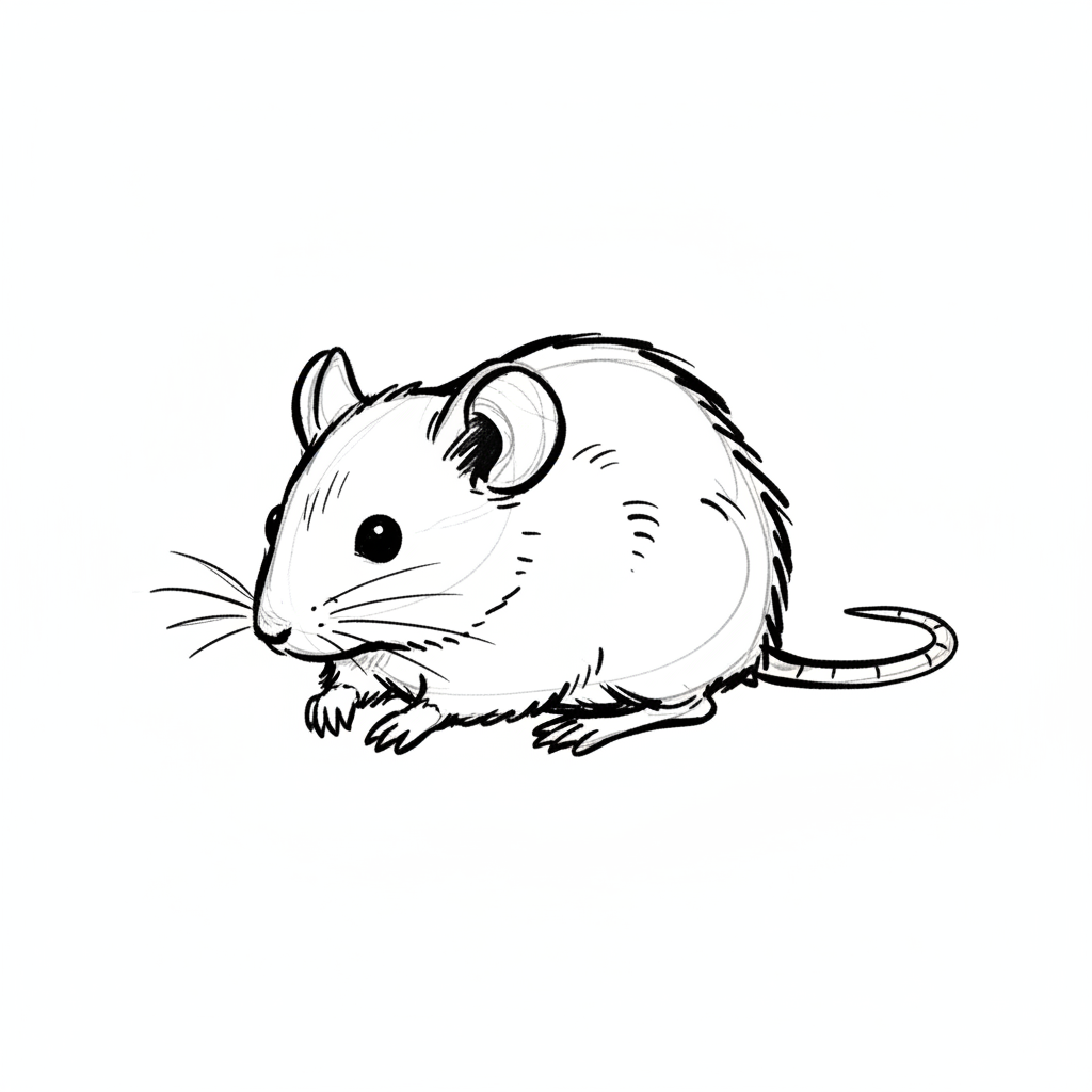 Zeichnung einer Maus mit dünnem Schwanz und kleinen Ohren.