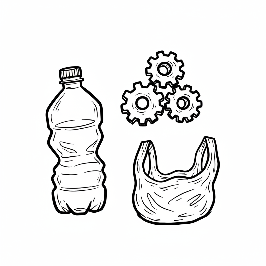 Schwarz-weiß-Zeichnung von Plastikflasche, Plastiktüte und Zahnrädern, symbolisiert Recycling.