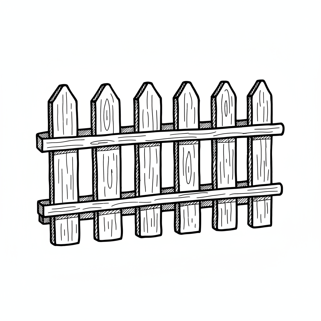 Schwarz-weiße, handgezeichnete Skizze eines Lattenzauns aus Holz.