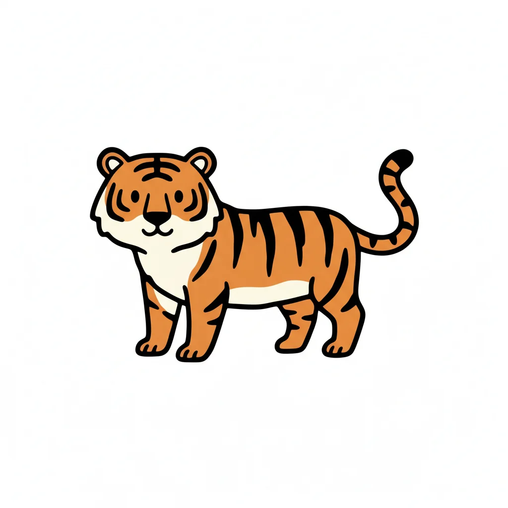 Ein cartoonartiger Tiger mit orangefarbenem Fell und schwarzen Streifen.