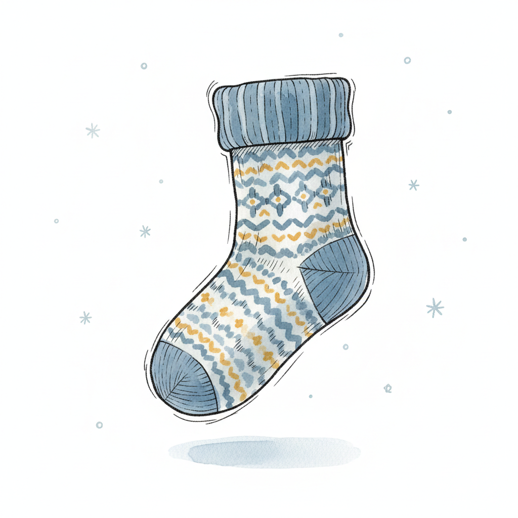 Bunte, gestrickte Socke mit verschiedenen Mustern schwebt vor einem schlichten Hintergrund.