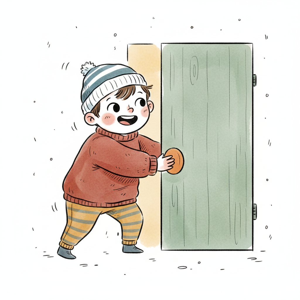 Ein fröhlicher Junge öffnet eine farbige Tür im Schnee.