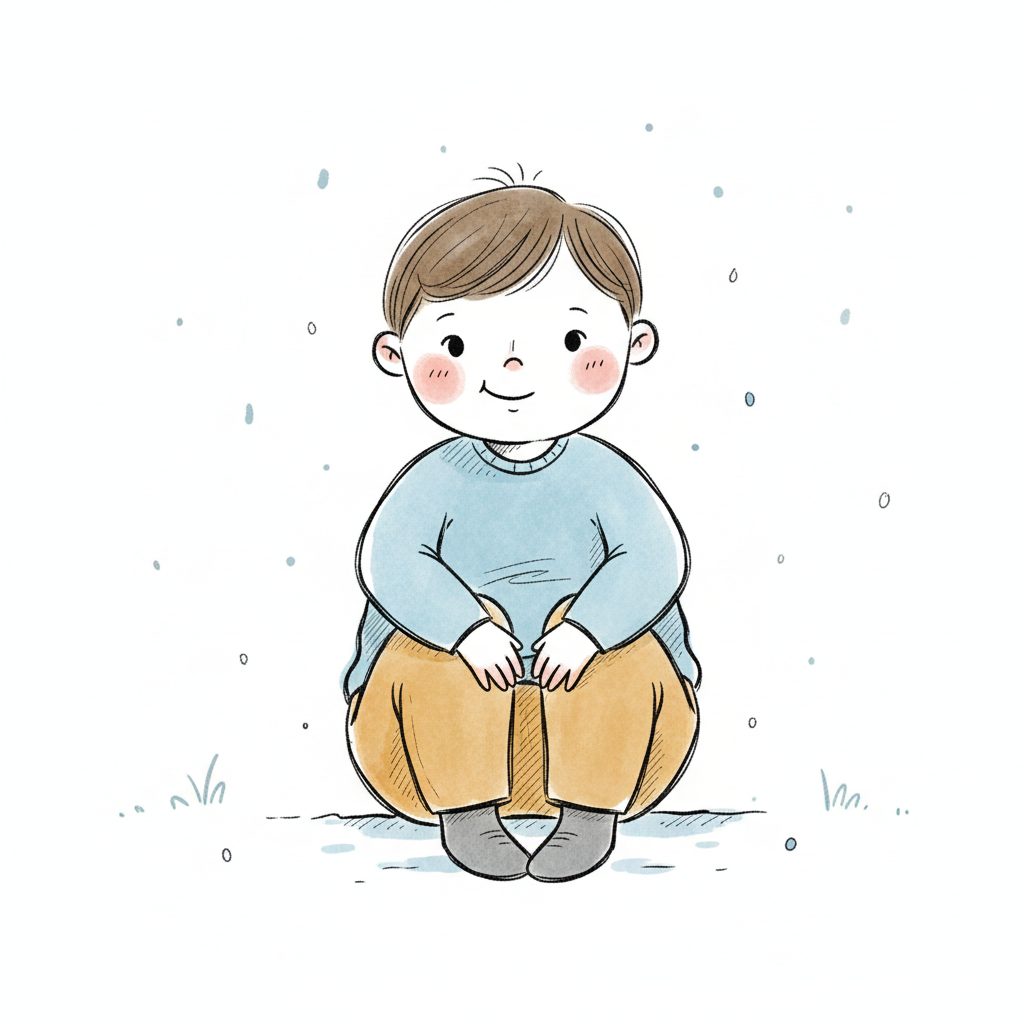 Niedliche, kindgerecht illustrierte Szene mit einem Kind oder einer Person als Hauptfigur, vor rein weißem Hintergrund, im frech-nordischen Aquarell-Skizzenstil. Klare, leicht wackelige Tuschekonturen, sichtbare Pinsel- und Strichtextur, dezente Schraffuren, weiche handgemalte Farbflächen in gedeckten Farben. Einfache, runde Formen. Keine harten Schatten, sondern sanfte, transparente Aquarellschichten. Leicht raue, handgezeichnete Linien statt glatter Vektorkanten. Subtile, vereinzelte Kritzelpunkte oder kleine Details im Hintergrund (wie Pünktchen oder feine Striche), aber keine echte Umgebung oder Landschaft. Die Figur ist mittig zentriert. Insgesamt charmant, humorvoll, warm und handgemacht wirkend. WICHTIG: Das Bild darf ABSOLUT KEINEN TEXT, KEINE BUCHSTABEN und KEINE ZAHLEN enthalten.