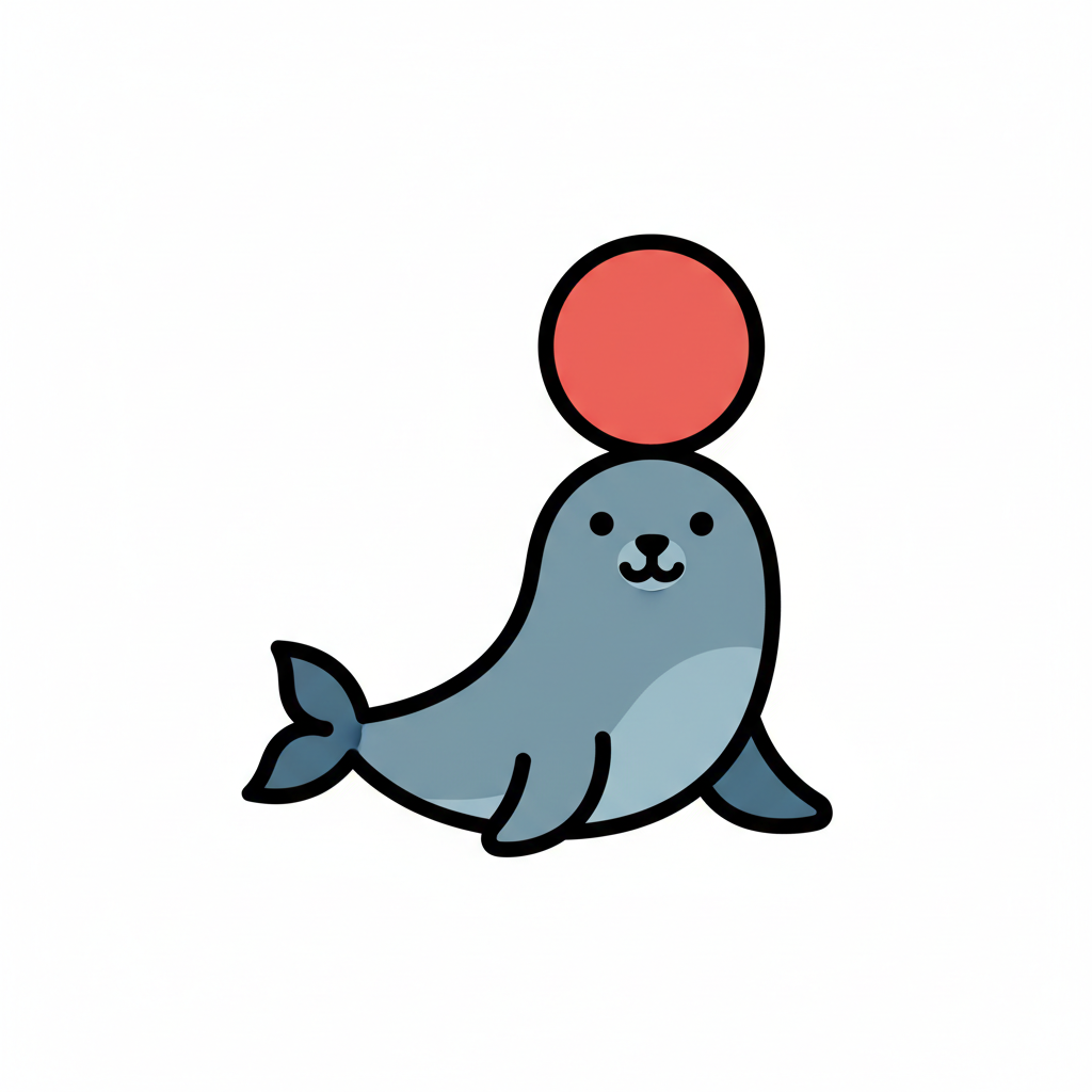 Niedliche Cartoon-Robbe balanciert einen roten Ball auf ihrer Nase, isoliert auf Weiß.