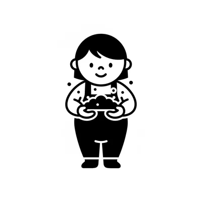 Schwarz-weiße Illustration einer lächelnden Person in Latzhose, die Erde oder Pflanzen hält.